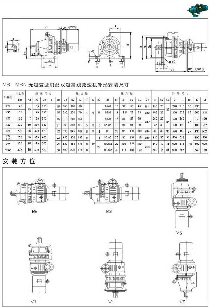 MB.MBN無級變速機配雙級擺線減速機外型安裝尺寸安裝方位